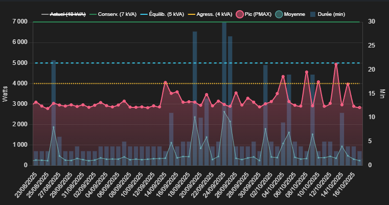 Cet outil analyse votre historique de consommation pour calculer la puissance idéale. Il prend en compte la tolérance thermique du compteur : le Linky permet de brefs dépassements de puissance sans disjoncter, et notre algorithme utilise cette marge pour vous faire économiser.